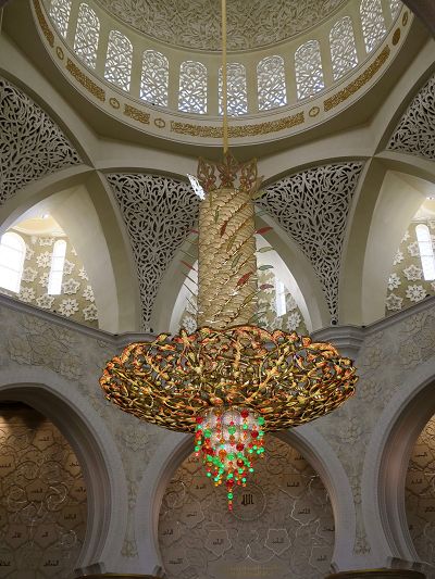 通往祈禱廳先經過廣大的長廊,象徵椰棗樹的柱子,代表先知穆罕默德帶領信徒於椰棗樹下禮拜,可見椰棗樹在清真寺的寓意。棗樹的葉子以真金打造,搭配藤蔓的柔軟線條,顯現了力與美的揉合,在藍天襯托下,白色映現所有的色彩,為沙漠揚塵中點綴了些許生命力。